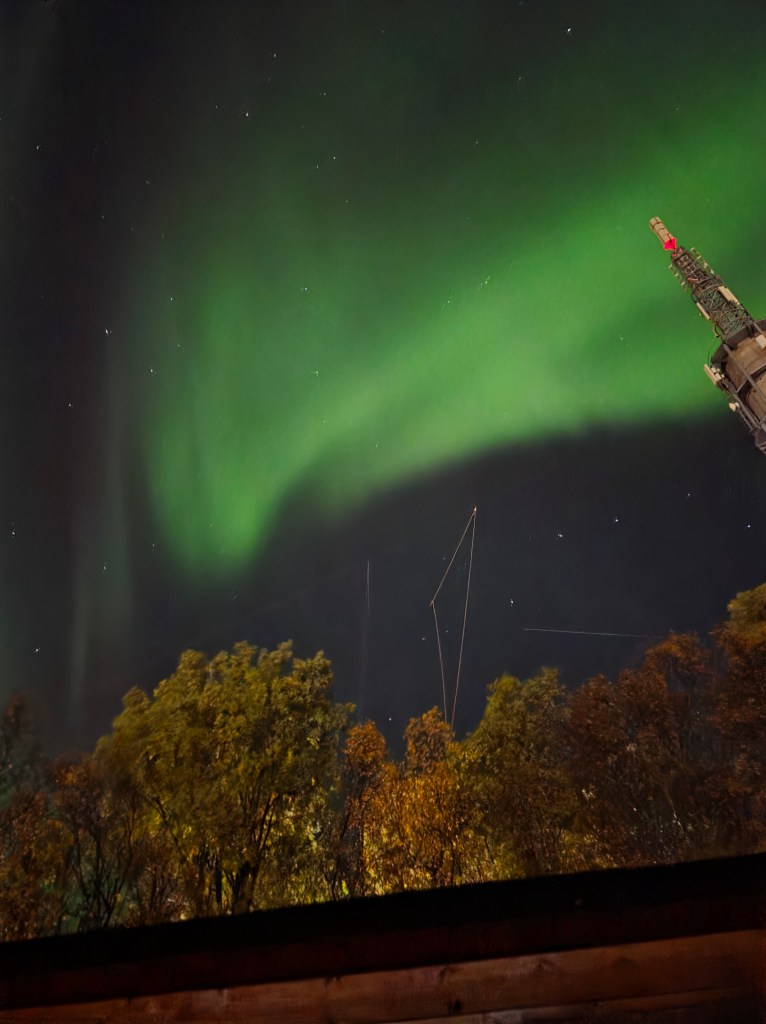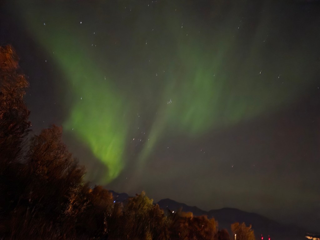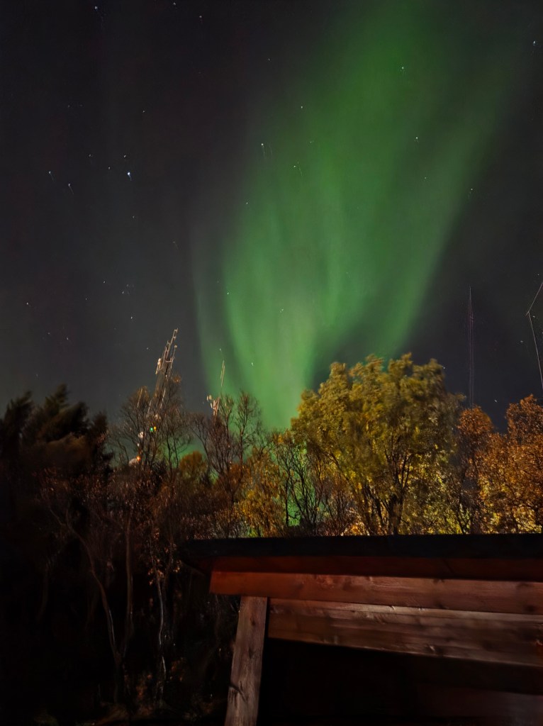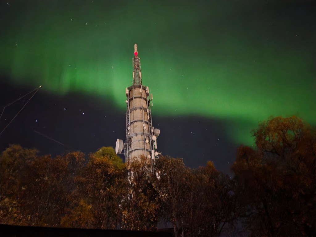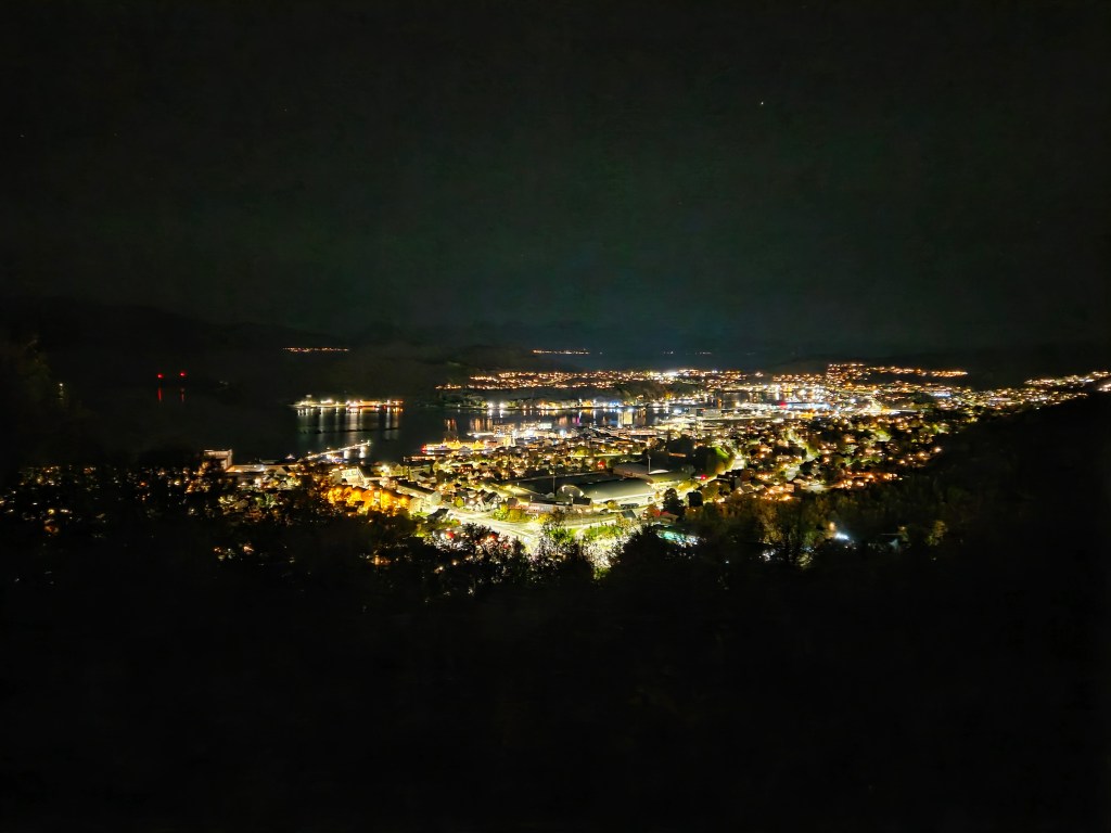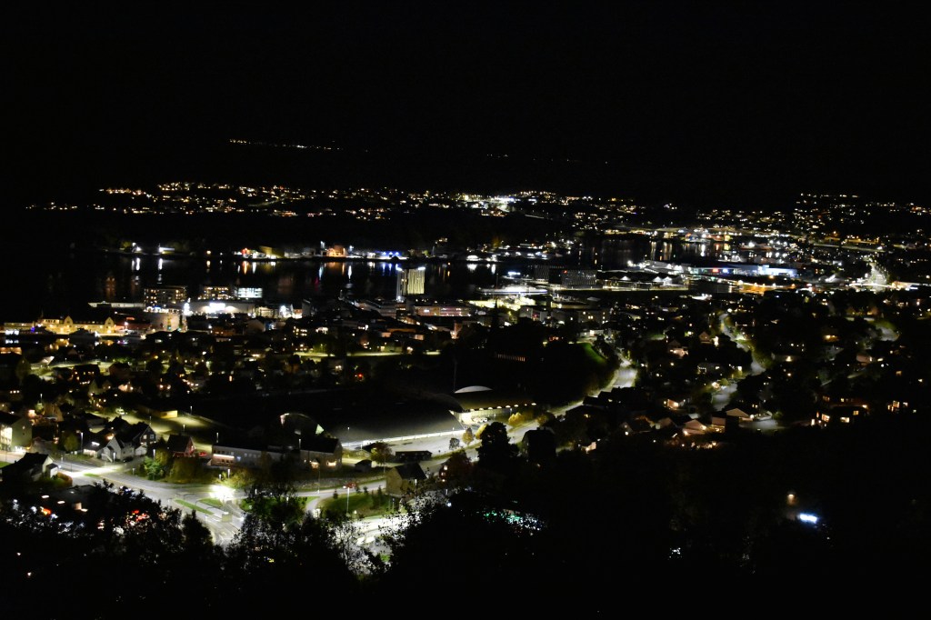 En toen, alsof dat alles nog niet genoeg was, kwam de kers op de taart. Op een avond sloeg de Aurorameter helemaal uit: 95% kans op noorderlicht. Dus trokken we laat op de avond de berg op, naar de TV-toren boven Harstad. Daar is het compleet donker en heb je een adembenemend uitzicht over de stad en de fjorden.