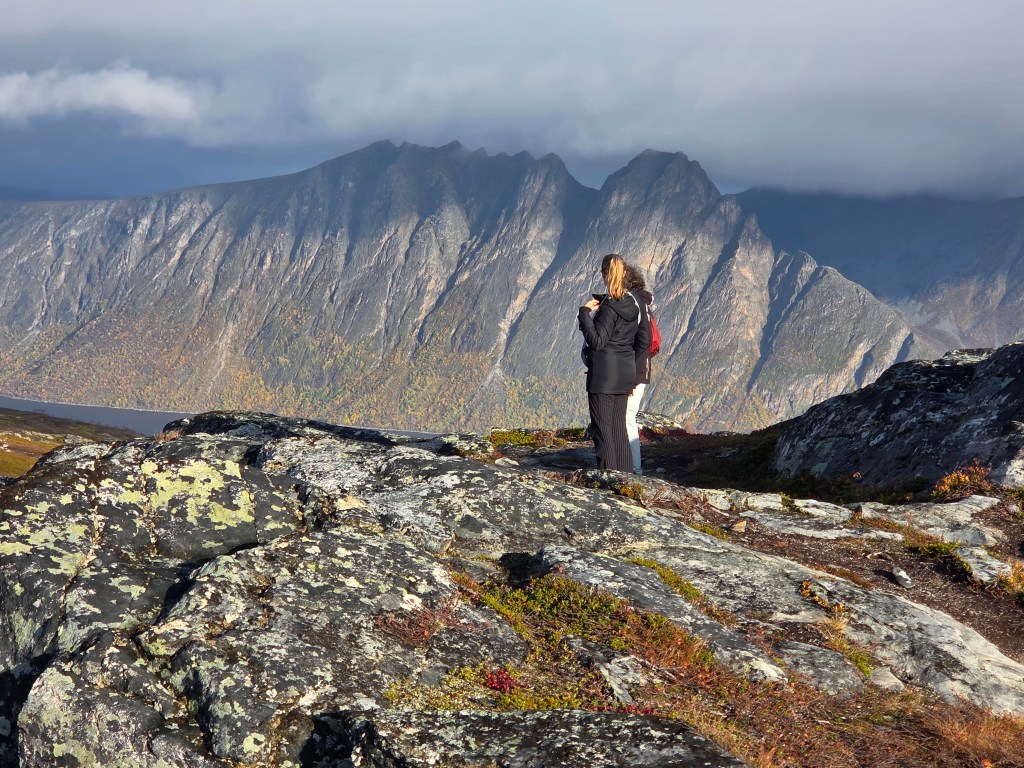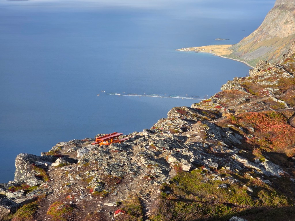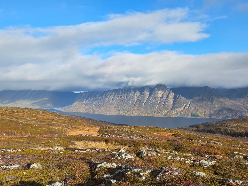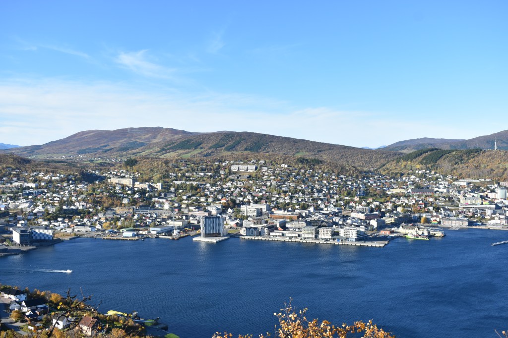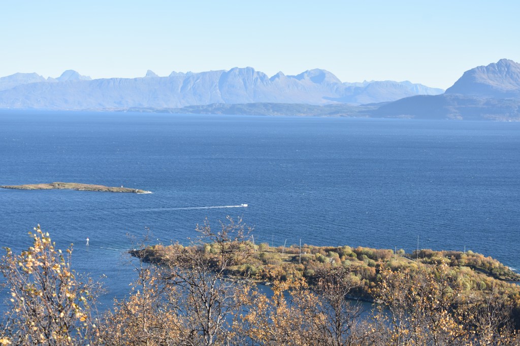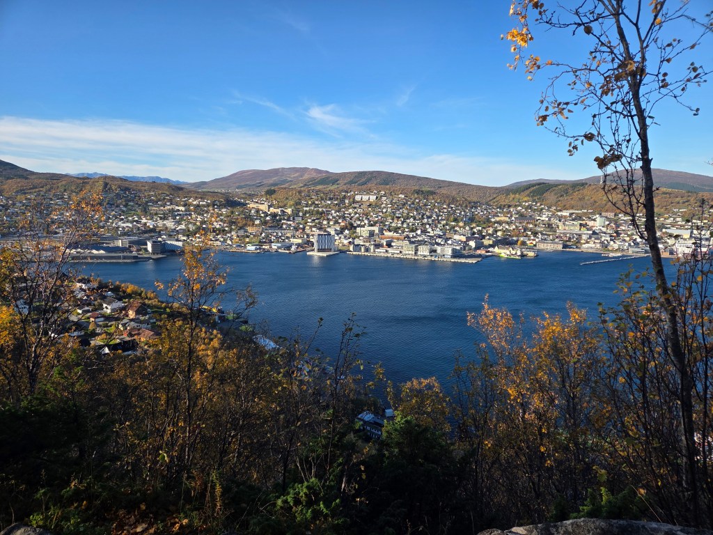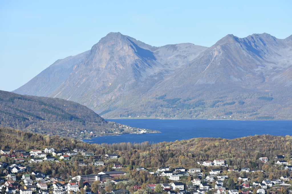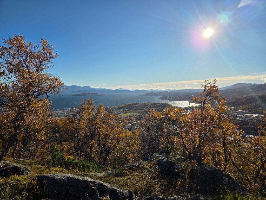 Maar eerst maken we in Harstad het staartje van de zomer mee. De zon laat zich nog vaak zien, de temperatuur is met een graad of 16 bijzonder aangenaam en voordat we de donkere tijd ingaan, moeten we toch die top aan de overkant eens beklimmen. We kijken er tenslotte elke dag op uit vanuit de woonkamer. De Gansåstoppen biedt vanaf 200 meter hoogte een mooi 360 graden panoramaoverzicht over Harstad en de fjord die daar weer achter ligt.