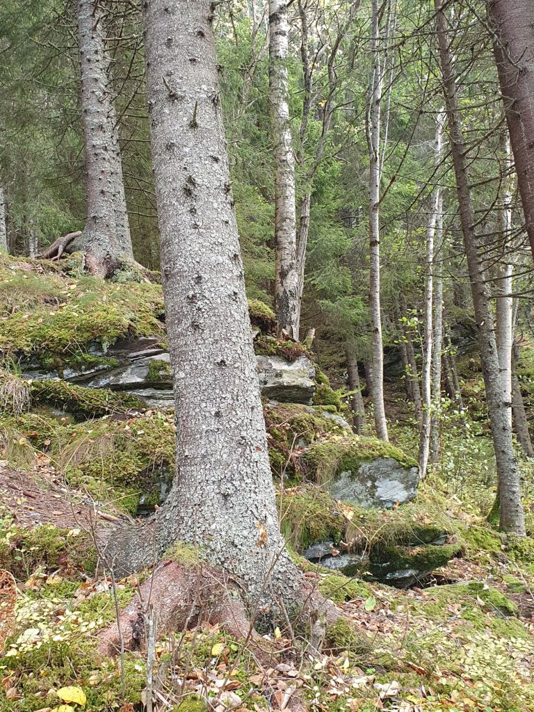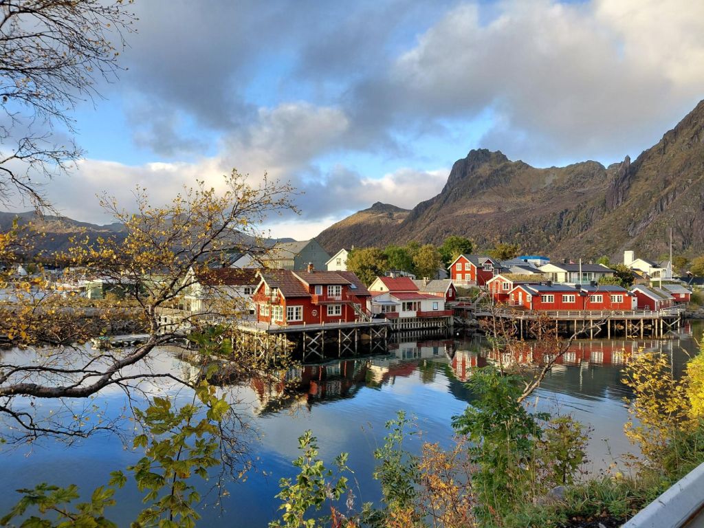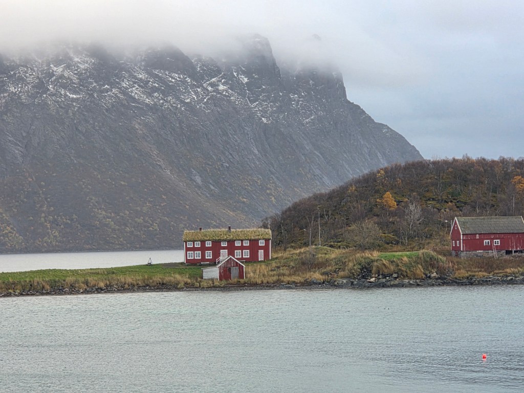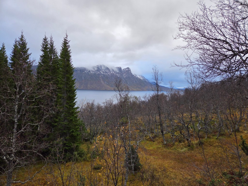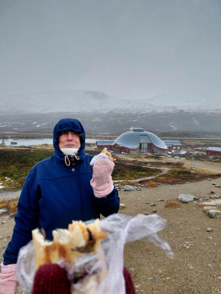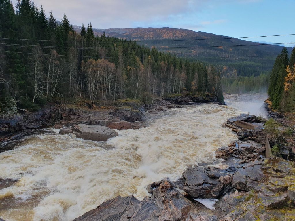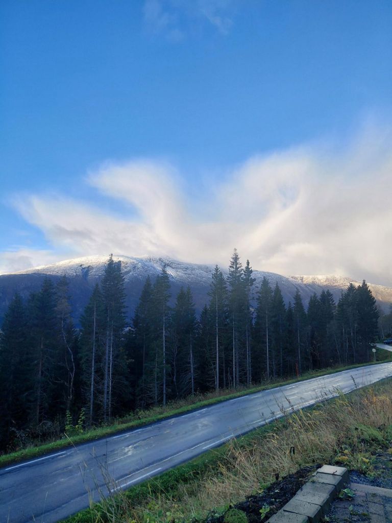 Het rijden met veel regen of lichte sneeuw en een laagstaande zon, valt op de vaak smalle, bochtige bergwegen nog niet mee. Je moet je aandacht er goed bijhouden. Het verbaast ons dat de gemiddelde Noor graag minstens 10 km sneller rijdt dan de maximaal toegestane snelheid (no pressure). Maar scenic is het wel. Het ene na het andere uitzinnig mooie landschap volgt elkaar op. De vele herfsttinten geven extra kleur aan het geheel. Soms zetten we de auto even stil om te kijken.