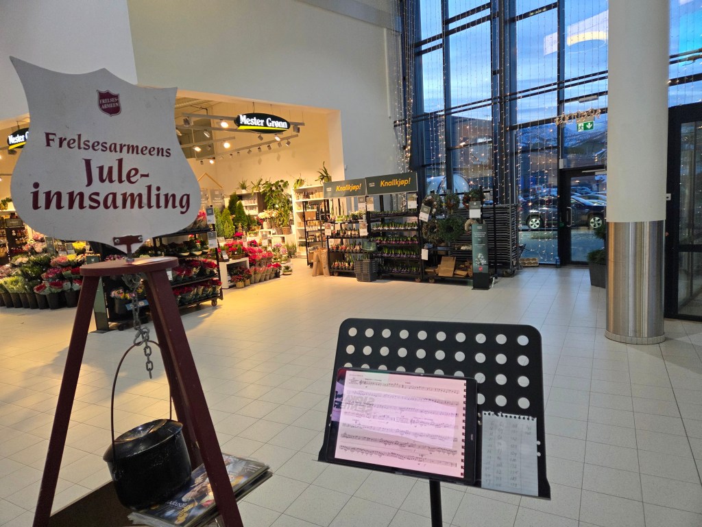 En zowaar, na weken porren, reclame maken op Facebook en zelfs het muziekkorps van het staande leger te hebben benaderd, had ik beet. Een clubje muzikanten uit het naburige Kvæfjord had wel zin in een potje toeteren. En zo stonden we op een zaterdag in winkelcentrum Sjøkanten en brachten er Juleglede!